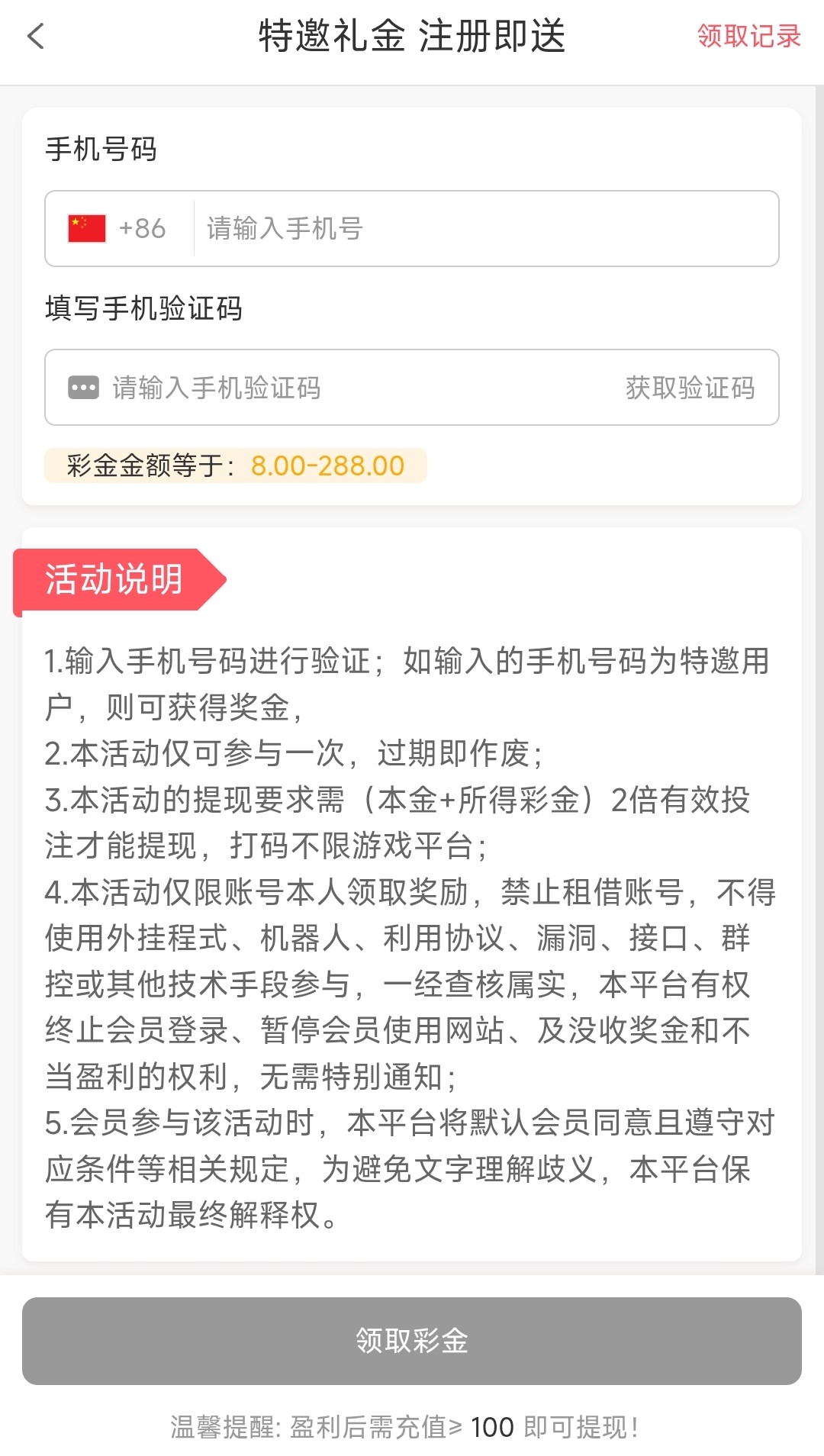注册后在优惠里领取彩金,不限游戏,出款需要存款100+所得彩金,2倍流水才能出款,自测